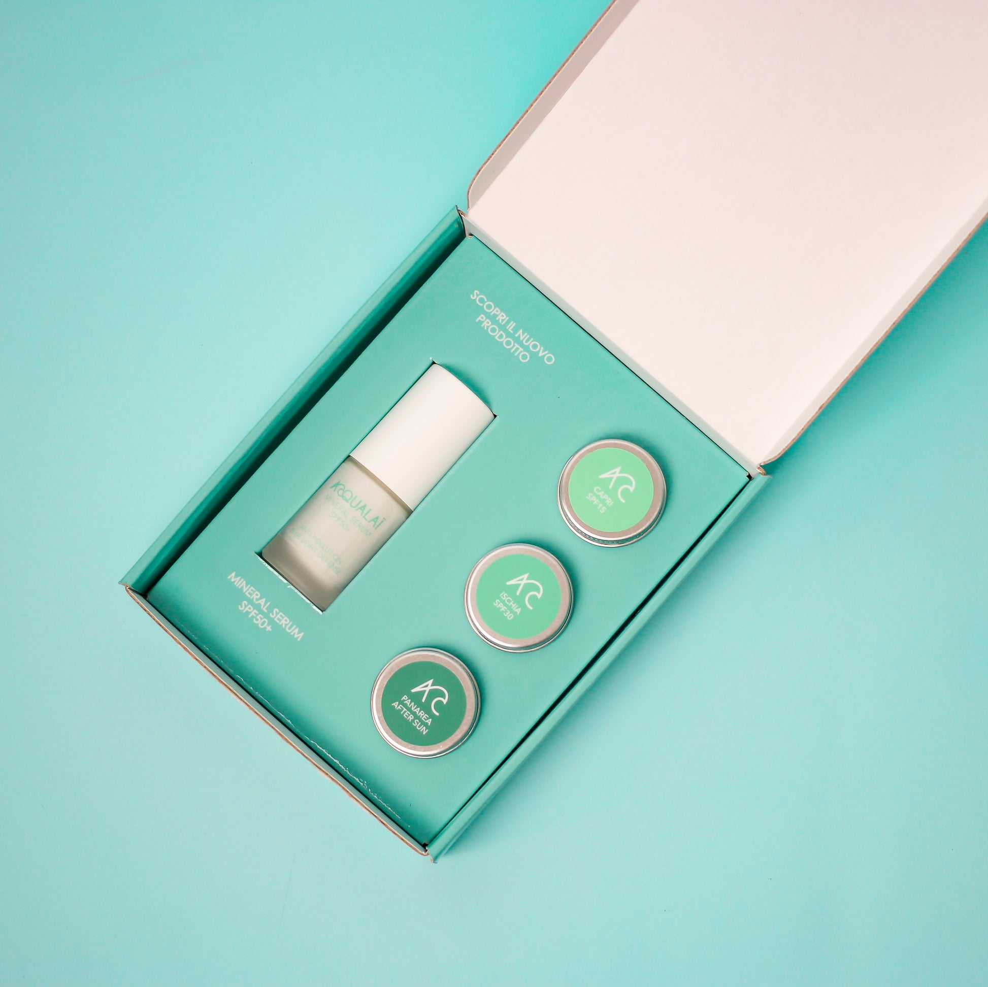 Regala la collezione Acqualaï grazie alla Christmas Discovery Box che include un assaggio dei nostri iconici Capri SPF15, Ischia SPF30, Panarea e Mineral Serum SPF50+ nelle loro mini versioni.